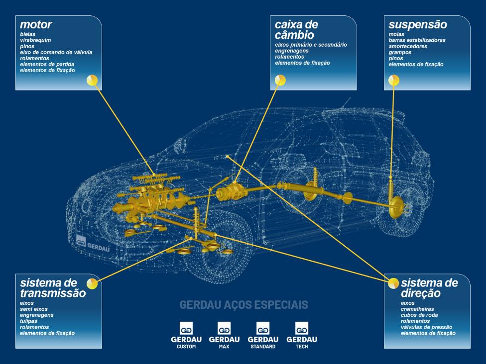 Os Aços Especiais da Gerdau estão presentes nos sistemas automotivos de: direção, transmissão, motor, suspensão e caixa de câmbio. Confira na imagem abaixo:
