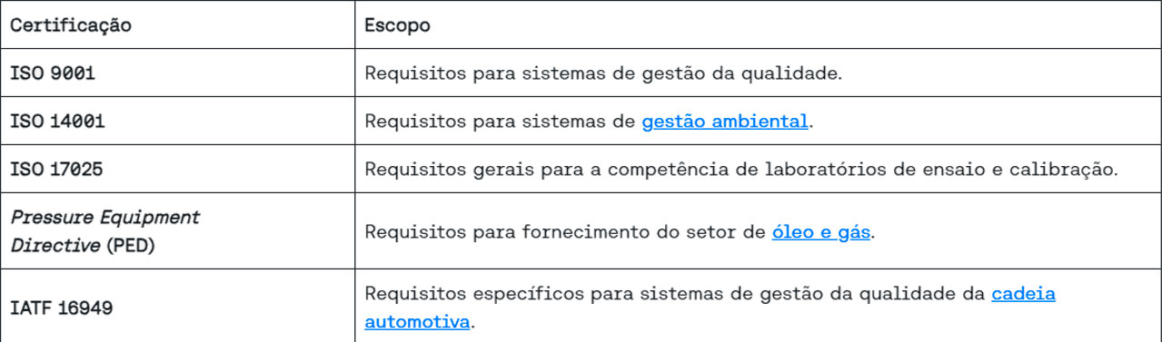 Cada certificação de qualidade abrange um escopo específico de requisitos. Entre as mais importantes na indústria metal-mecânica, estão: