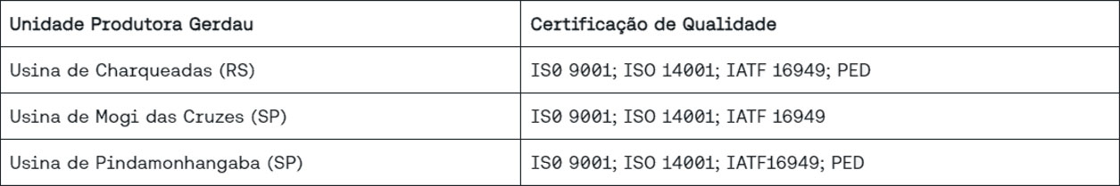 Confira abaixo as certificações referentes a cada usina Gerdau Aços Especiais. Para baixar o certificado de seu interesse, clique na sigla listada na coluna à direita: