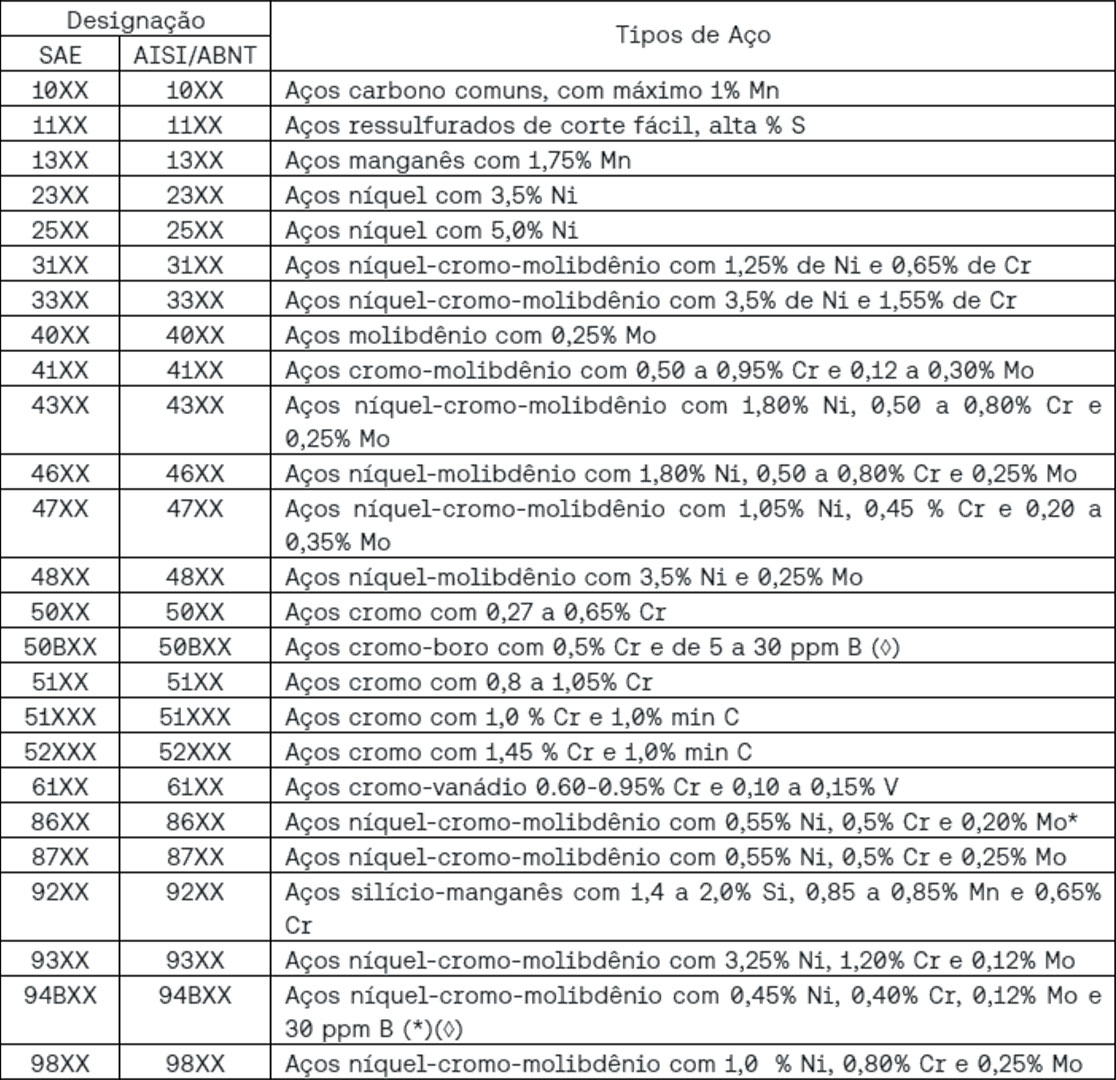 Os algarismos XX presentes no final da designação, indicam a porcentagem em peso de carbono na composição química do aço, multiplicado por 100. Assim um aço 1045 é um aço carbono, contendo no máximo 1% Mn (10XX) e 0,45% em peso de carbono em sua composição química. Quando a designação termina com XXX, o teor de carbono é igual ou ultrapassa 1,0 %. É o caso do aço para rolamento 52100, também conhecido como “aço prata”, de elevada dureza e alta resistência ao desgaste e à fadiga de contato, cuja composição química é 1,45% Cr e 1,0 %C. A Tabela abaixo indica as designações atribuídas aos diferentes tipos de aços para construção mecânica e a respectiva descrição em termos de composição química.