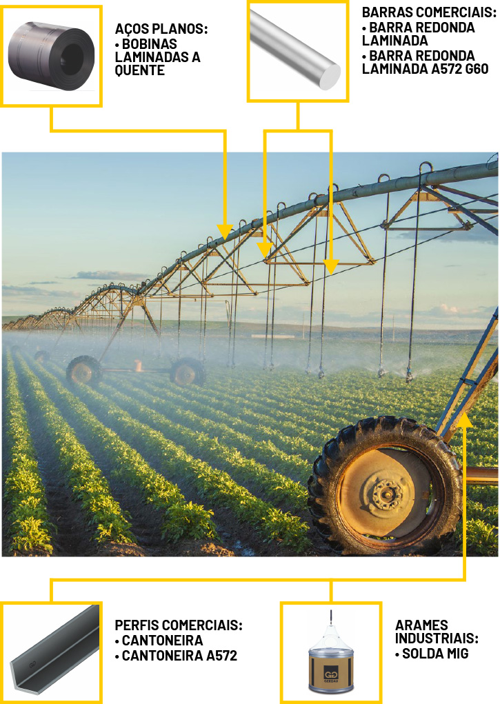 A Gerdau possui participação significativa dentro do segmento agrícola, um dos exemplos de uso do aço Gerdau para proporcionar resistência estrutural ao sistema de irrigação é nos pivôs.